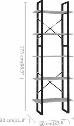 Deze kast is gemaakt van hoogwaardig spaanplaat en heeft een metalen frame, waardoor hij stevig en duurzaam is. Hij heeft 5 schappen, die voldoende ruimte bieden voor het opbergen van boeken, tijdschriften en andere decoratieve spullen. Het meubel is gemakkelijk schoon te maken met een vochtige doek.