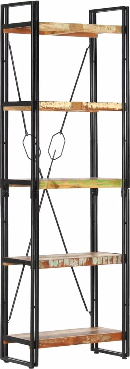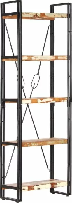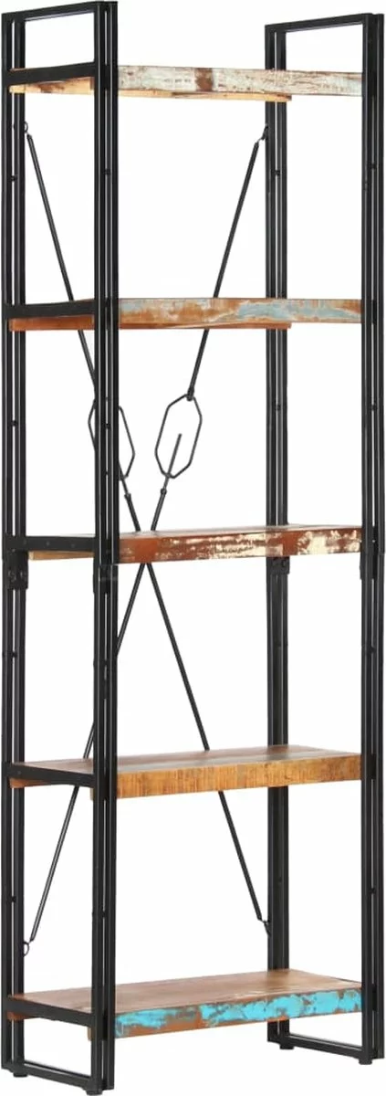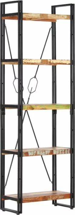 De boekenkast heeft een stevig gepoedercoat ijzeren frame dat de kast een industriële uitstraling geeft. De retro schappen zijn gemaakt van massief gerecycled hout dat afkomstig is van balken, vloeren en steunbalken van oude gebouwen die zijn gesloopt. Het kan dus bestaan uit verschillende houtsoorten, zoals grenen, teak, beuken, eiken, ceder, mangohout en acacia. Dit betekent dat het teruggewonnen hout de kenmerken van deze verschillende houtsoorten behoudt. Gerecycled hout is al verouderd, verweerd en gedroogd, dus het krimpt en buigt niet. Elke stap van het proces wordt met de grootste zorg uitgevoerd, of het nu polijsten, schilderen of lakken is. Het vakmanschap en de opvallende houtnerven maken elk meubelstuk verschillend en net iets anders dan de rest.