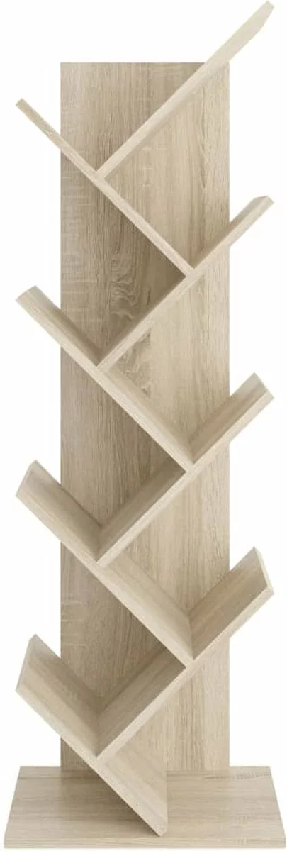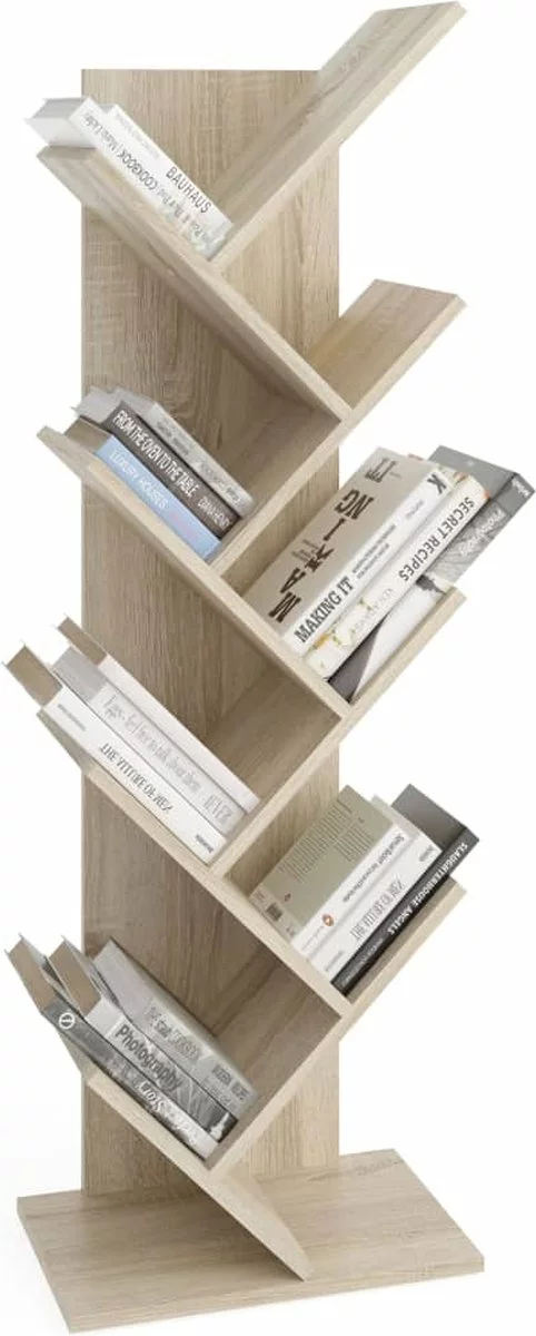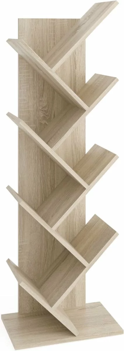 Deze staande eikenkleurige boekenplank van FMD heeft een geometrisch silhouet en een special ontwerp dat is geïnspireerd op de vorm van een boom, waardoor het een uniek wandrek is.