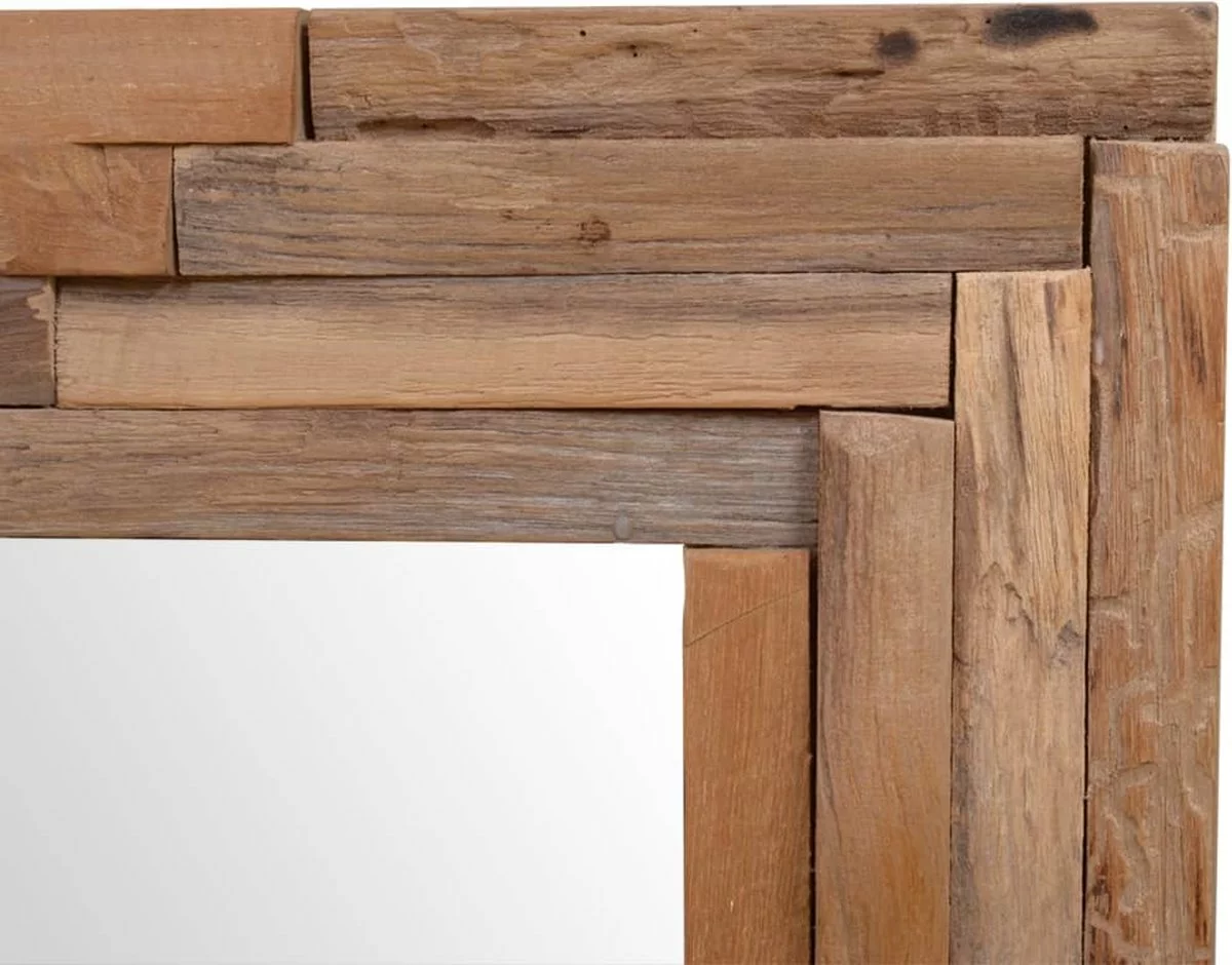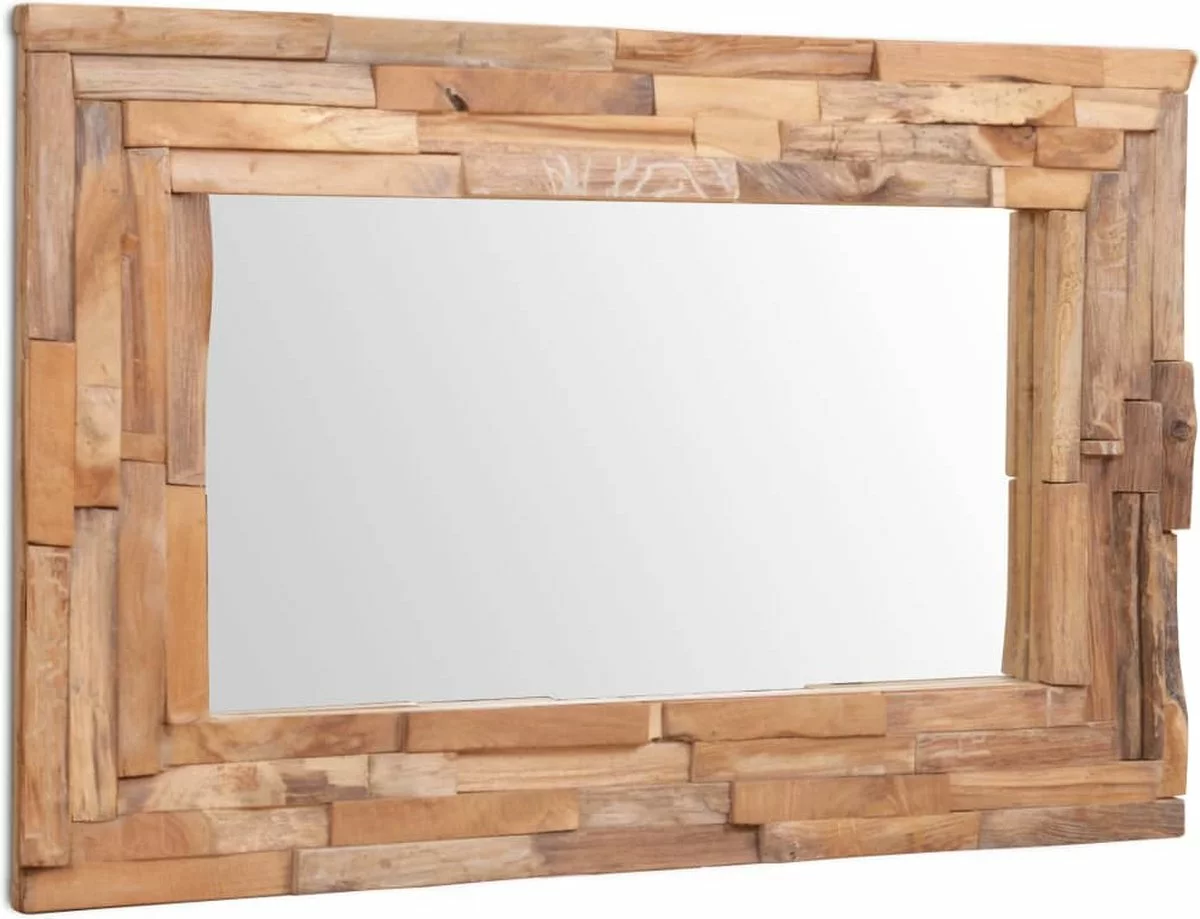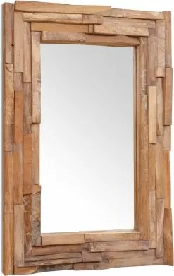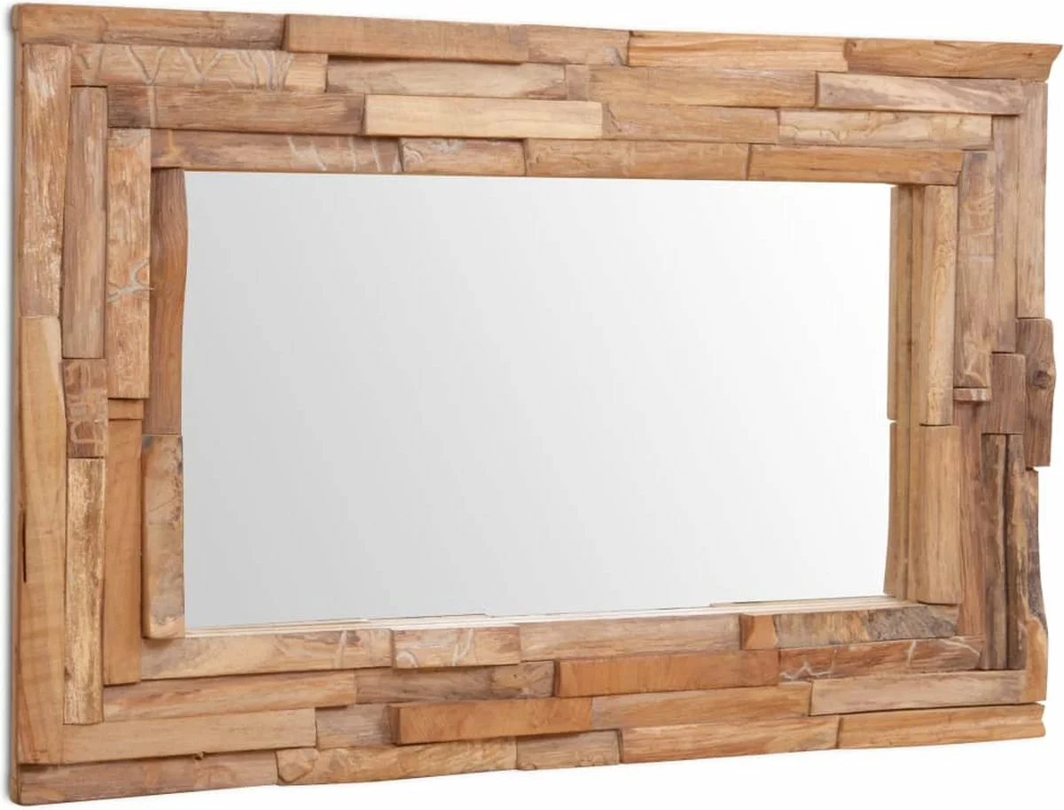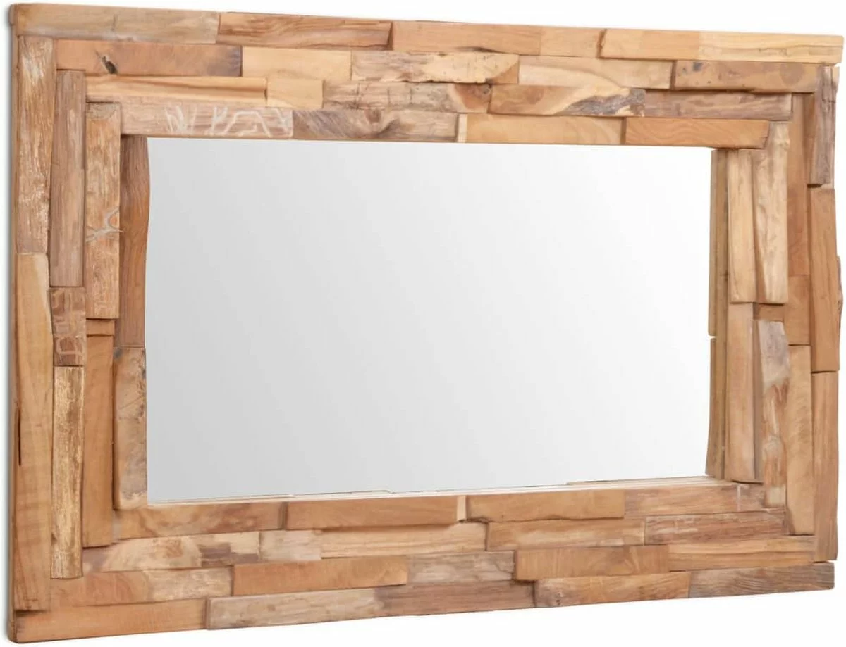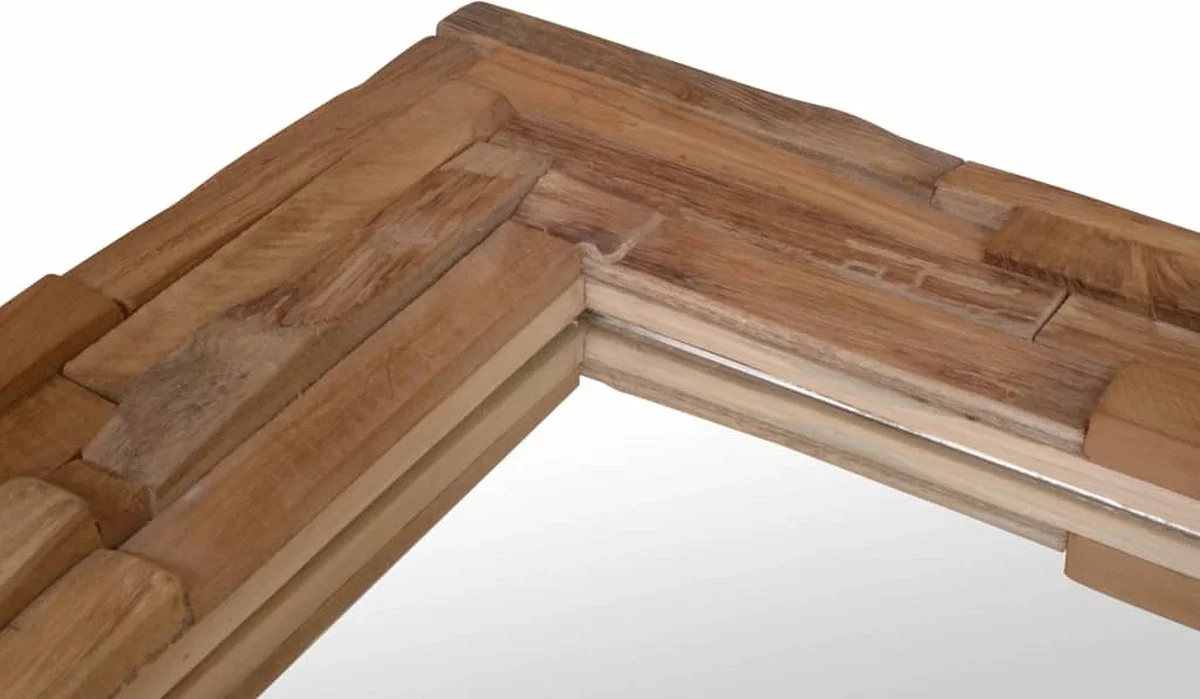 Het spiegelframe is gemaakt van stukken teakhout die op een willekeurige manier zijn geplaatst, dit draagt bij aan de rustieke stijl van de spiegel. Deze spiegel ziet er goed uit in iedere kamer, en kan ook worden gebruikt in de badkamer.