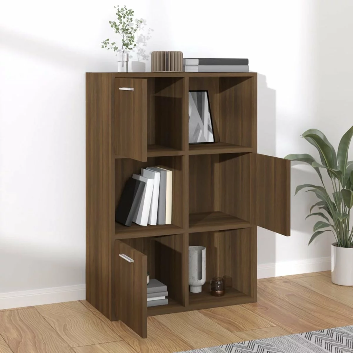 - Veel opbergruimte: de boekenkast heeft 3 open vakken en 3 vakken met deuren en biedt voldoende ruimte om tijdschriften, boeken, dvd’s, multimedia-apparaten en decoratieve spullen goed georganiseerd en binnen handbereik te houden.