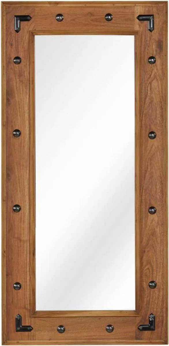 Deze houten spiegel heeft een massief acaciahouten frame, straalt een vintage charme uit en is met zijn unieke ontwerp een perfecte en aantrekkelijke decoratie voor je huis. Hij kan in de gang of in de badkamer worden gebruikt.