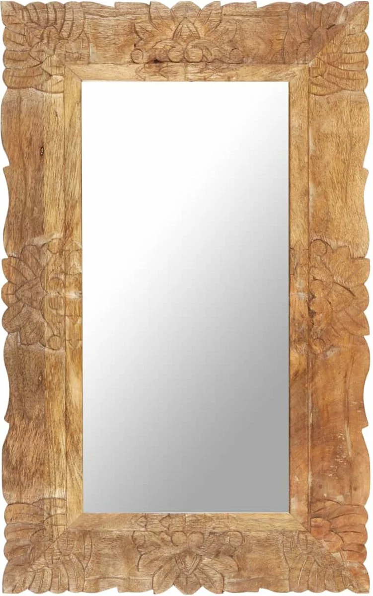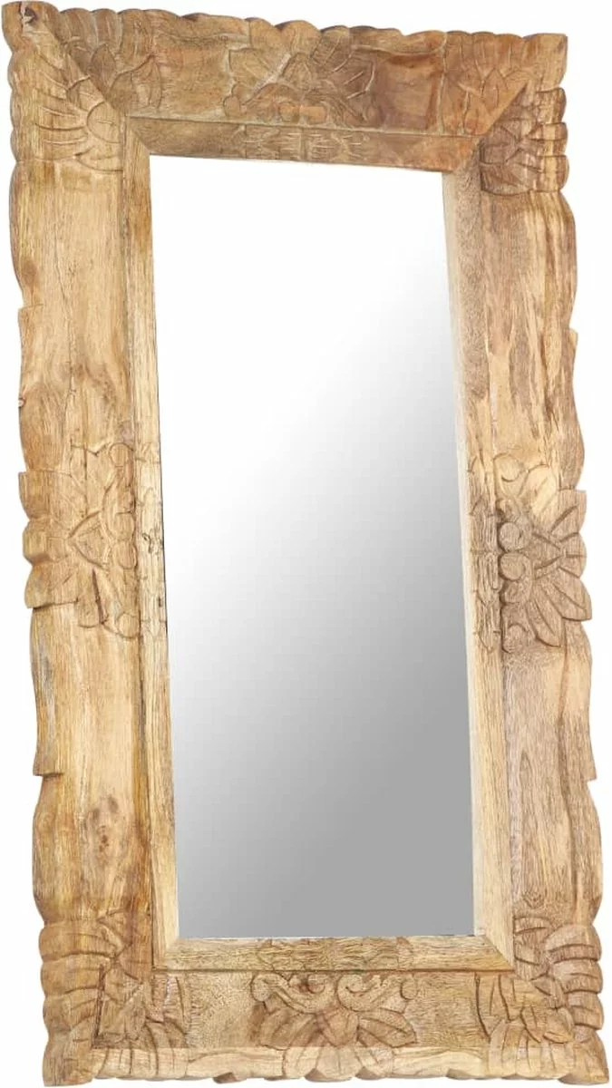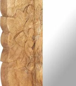 Massief mangohout is een tropisch hardhout. Het heeft de kracht om veel gewicht te dragen en is bestand tegen slijtage. Bovendien zorgen het voortreffelijke vakmanschap en de prachtige houtnerven ervoor dat elke houten spiegel net iets anders is dan de rest. Het met de hand gesneden patroon draagt bij aan de schoonheid.
