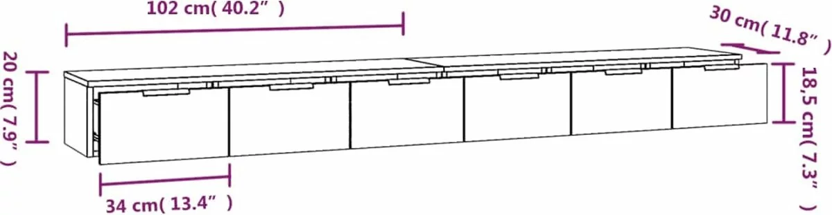 - Afmetingen (elk): 102 x 30 x 20 cm (B x D x H)