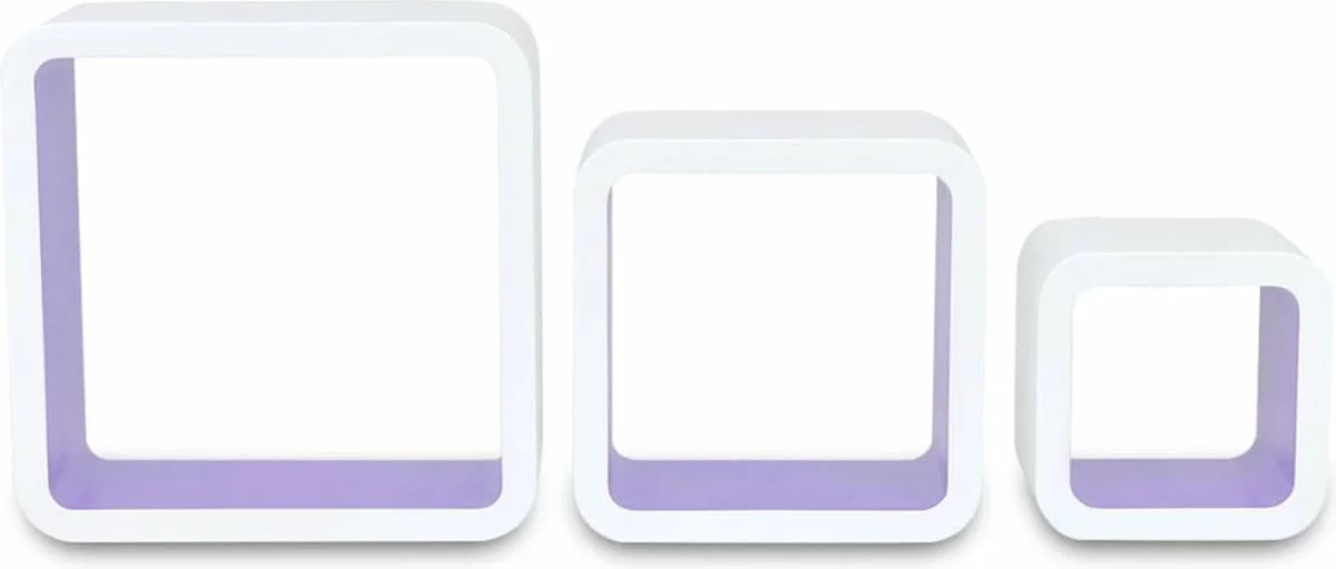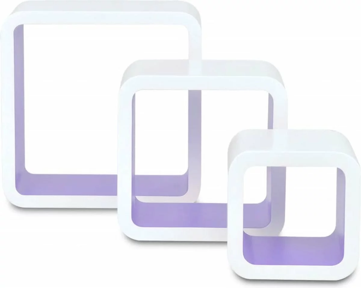 De levering bevat 6 kubusvormige wandplanken, schroeven en muurpluggen.