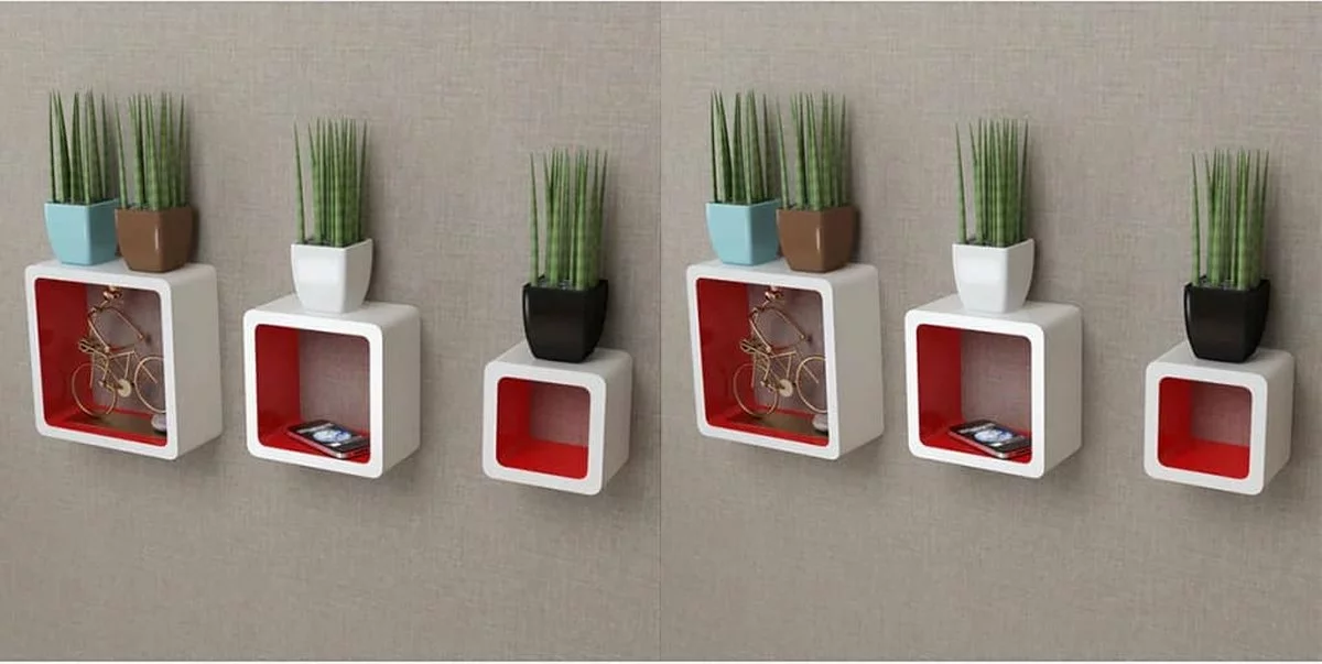 De levering bevat 6 kubusvormige wandplanken, schroeven en muurpluggen.