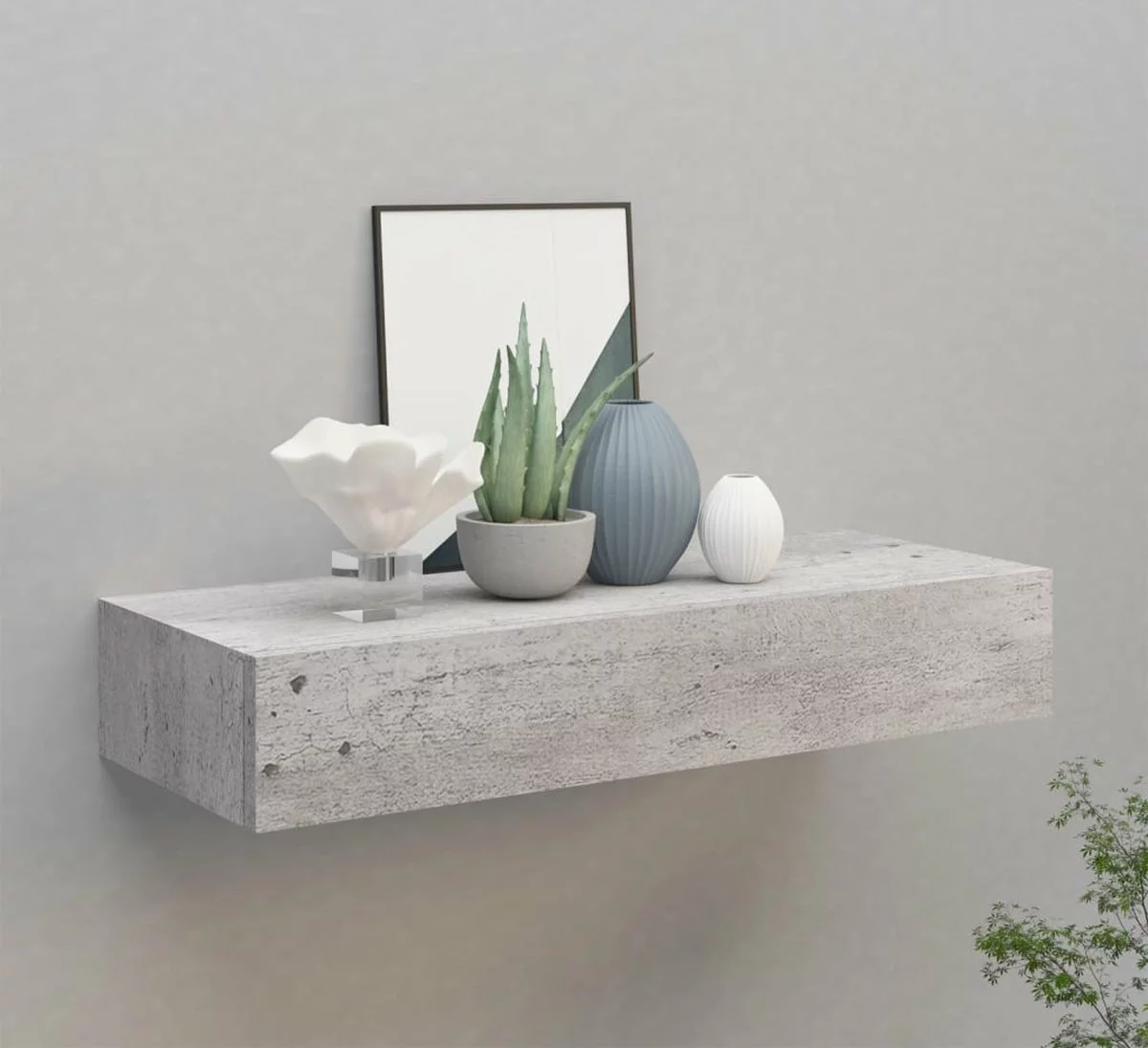 Dit zwevende schap is gemaakt van MDF en metaal en heeft een lange levensduur. Dit aan de muur te bevestigen schap met lade biedt voldoende ruimte om fotolijsten, verzamelobjecten, boeken, speelgoed, kleine planten, enz. op te zetten. Het voegt sfeer en stijl toe aan verschillende kamers en geeft ze een ruimtelijk gevoel.