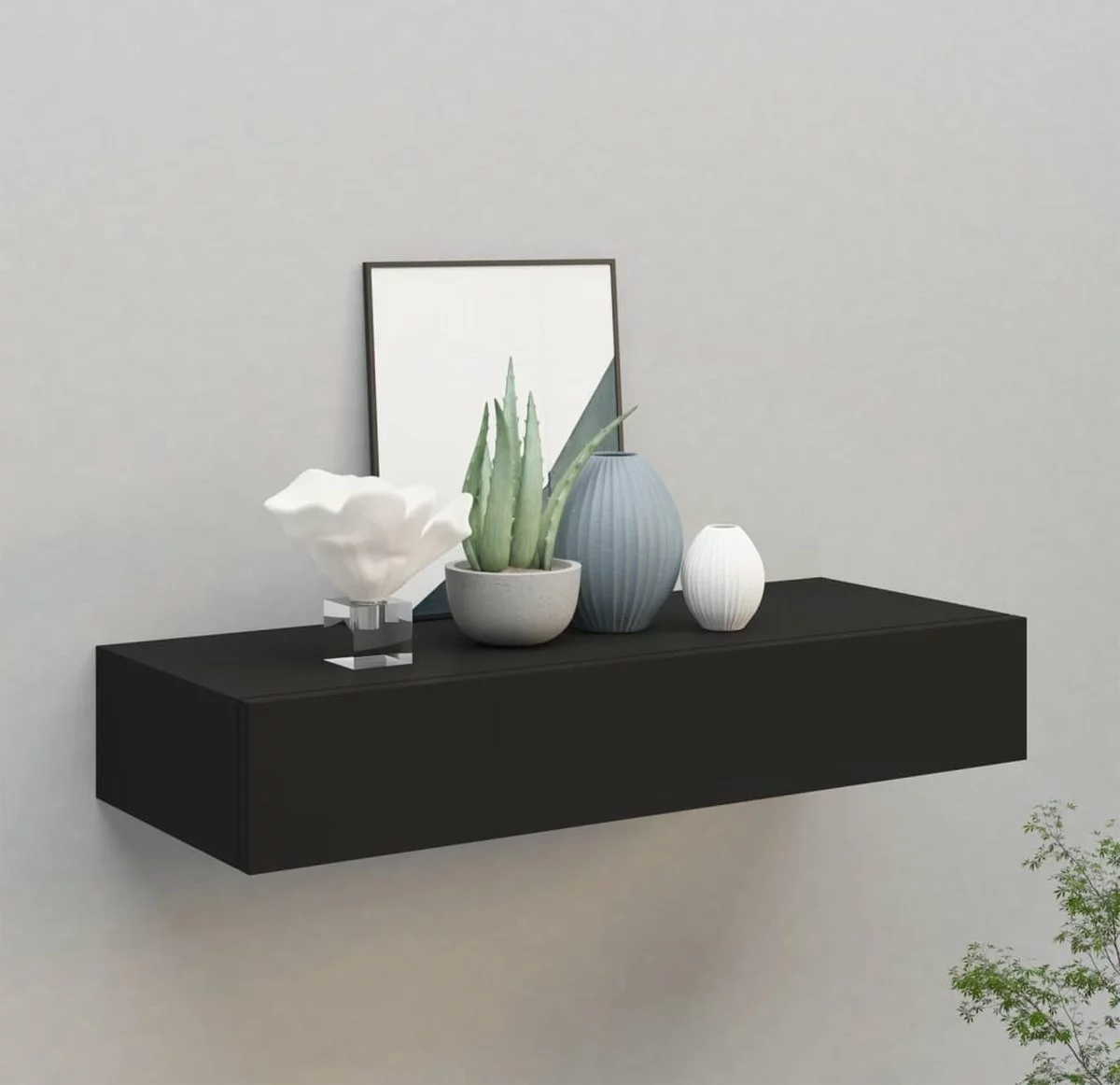 Dit zwevende schap is gemaakt van MDF en metaal en heeft een lange levensduur. Dit aan de muur te bevestigen schap met lade biedt voldoende ruimte om fotolijsten, verzamelobjecten, boeken, speelgoed, kleine planten, enz. op te zetten. Het voegt sfeer en stijl toe aan verschillende kamers en geeft ze een ruimtelijk gevoel.